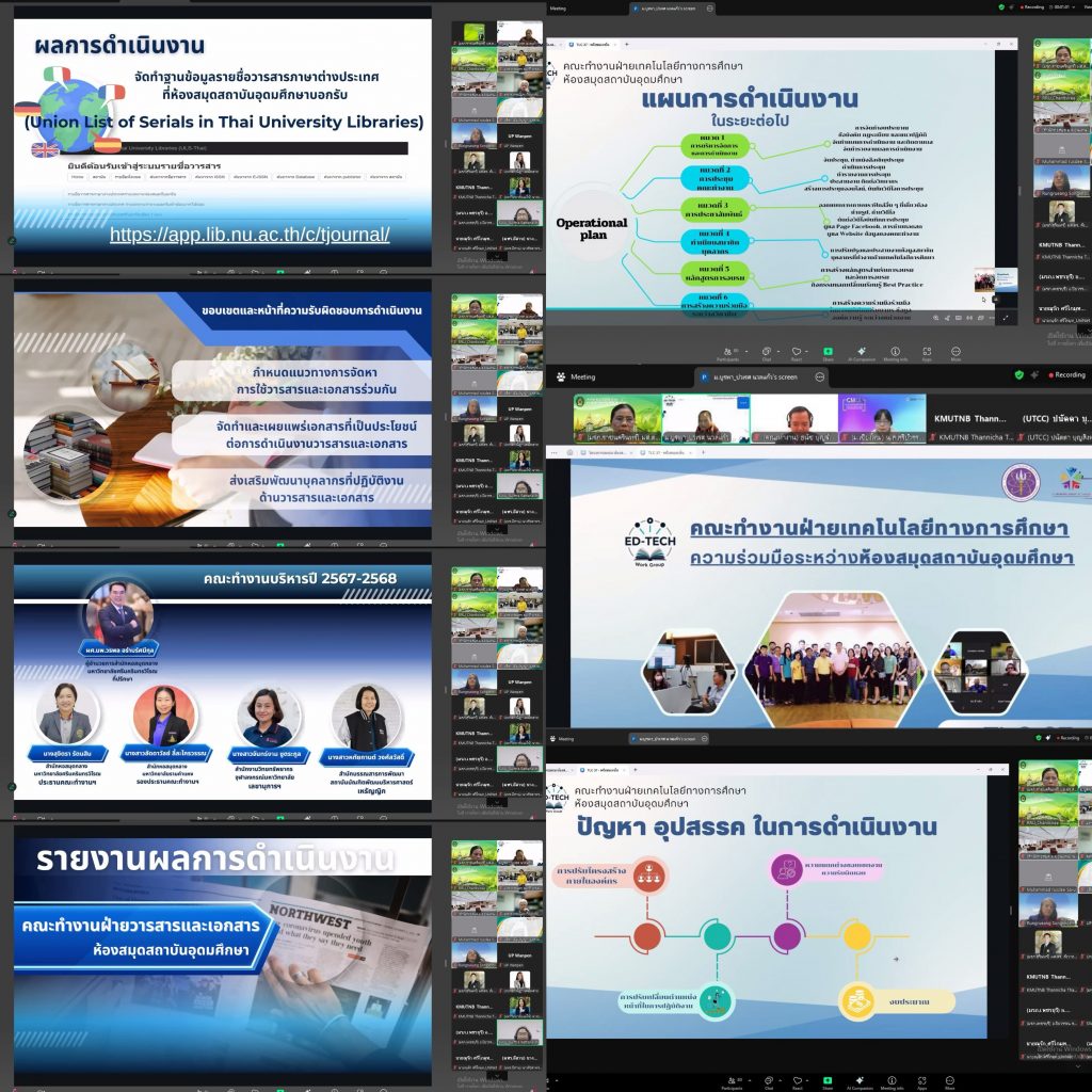 วันจันทร์ที่ 23 มิถุนายน 2568 เวลา 10.00 – 12.00 น. ผศ.ดร.สายฝน เสกขุนทด ผู้อำนวยการสำนักวิทยบริการและใช้เทคโนโลยีสารสนเทศ ร่วมประชุมผู้บริหารห้องสมุดสถาบันอุดมศึกษา เพื่อรายงาน ความก้าวหน้าของการดําเนินงานความร่วมมือระหว่างห้องสมุดสถาบันอุดมศึกษา เนื่องจากสํานักงานปลัดกระทรวงการอุดมศึกษา วิทยาศาสตร์ วิจัยและนวัตกรรม ร่วมกับ มหาวิทยาลัยนครพนม กําหนดจัดสัมมนาความร่วมมือระหว่างห้องสมุดสถาบันอุดมศึกษา ครั้งที่ 37 “พื้นที่การเรียนรู้และการเปลี่ยนแปลงแห่งนวัตกรรม : เสริมสร้างทักษะเพื่อห้องสมุดแห่งอนาคต” (Innovative and Transformative Library Spaces : Empowering Skills for Future Libraries) ในระหว่างวันที่ 8 – 9 กรกฎาคม 2568 ณ หอประชุมวชิรบพิตร มหาวิทยาลัยนครพนม จังหวัดนครพนม ผ่านการประชุมออนไลน์ (Zoom Meeting)