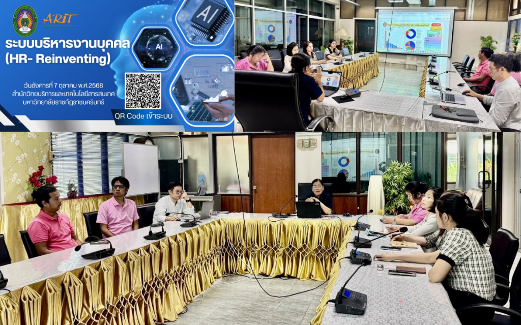 วันอังคารที่ 7 ตุลาคม 2568 เวลา 13.30 น. สำนักวิทยบริการและเทคโนโลยีสารสนเทศ ได้จัดประชุมร่วมกับ บุคลากรงานบริหารงานบุคคล เพื่อติดตามความคืบหน้า และตรวจสอบความถูกต้องและความเรียบร้อยของระบบ HR-Reventing โดยมุ่งเน้นในการสร้างสรรค์วิธีการใหม่ ๆ แก้ไขปัญหาและตอบโจทย์ความต้องการขององค์กรยุคดิจิทัล ณ ห้องประชุมสำนักวิทยบริการและเทคโนโลยีสารสนเทศ มหาวิทยาลัยราชภัฏราชนครินทร์