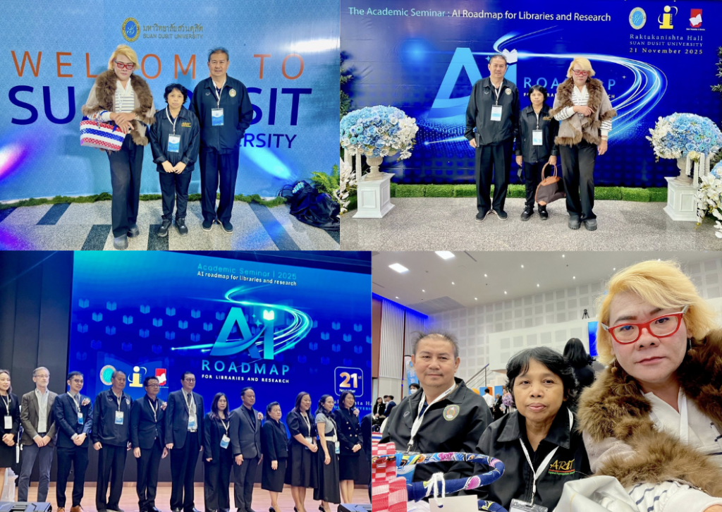 วันศุกร์ที่ 21 พฤศจิกายน 2568 อาจารย์สิทธิศักดิ์ อรรจนานนท์ รองผู้อำนวยการสำนักวิทยบริการและเทคโนโลยีสารสนเทศ พร้อมด้วย รักษาการในตำแหน่งหัวหน้างานวิทยบริการ และบุคลากรงานวิทยบริการ เข้าร่วมงาน “AI Roadmap for Library and Research” จัดขึ้นเพื่อแลกเปลี่ยนมุมมองและแนวทางการใช้ปัญญาประดิษฐ์ (AI) ในงานห้องสมุด การจัดการความรู้ และงานวิจัย พร้อมการเสวนาจากผู้เชี่ยวชาญทั้งในและต่างประเทศ ณ หอประชุมรักตะกนิษฐ มหาวิทยาลัยสวนดุสิต กรุงเทพมหานคร