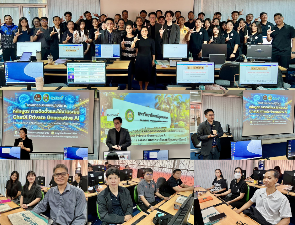 วันพุธที่ 4 มีนาคม 2569 เวลา 8.30 – 16.30 น. สำนักวิทยบริการและเทคโนโลยีสารสนเทศ มหาวิทยาลัยราชภัฏราชนครินทร์ จัดโครงการอบรมเชิงปฏิบัติการ หลักสูตร การติดตั้งและใช้งานระบบ ChatX Private Generative AI สำหรับนักศึกษา บุคลากร อาจารย์ มหาวิทยาลัยราชภัฏราชนครินทร์ วิทยากรจาก Go Digit Co., Ltd. ณ ห้องปฏิบัติการคอมพิวเตอร์ 900